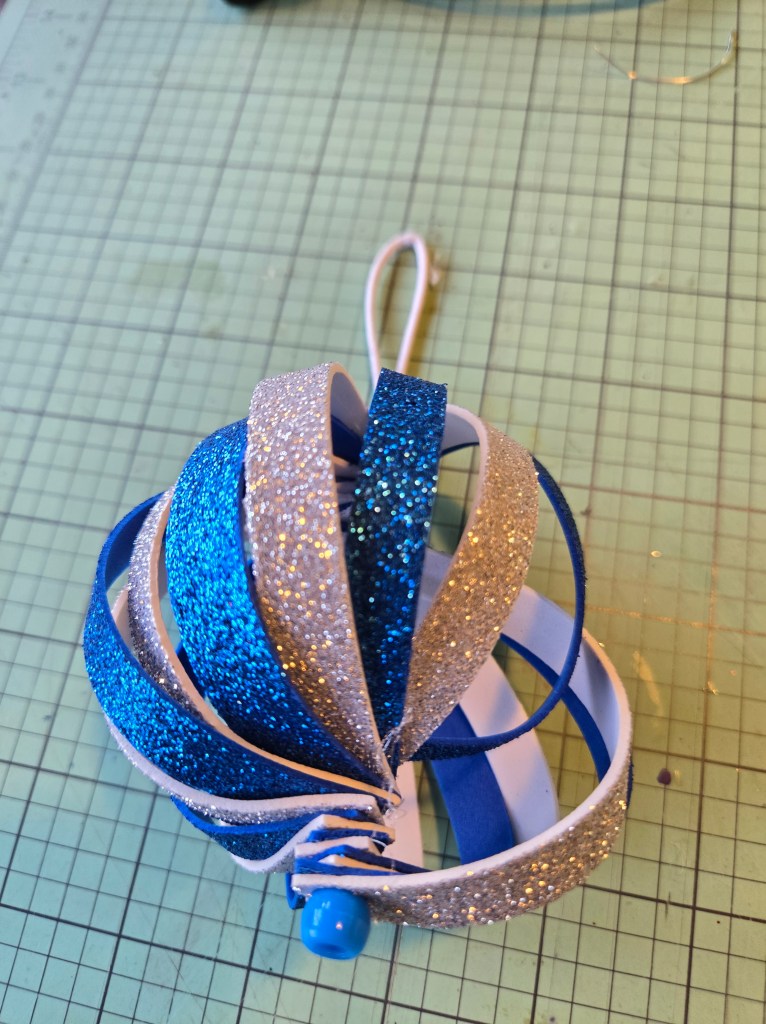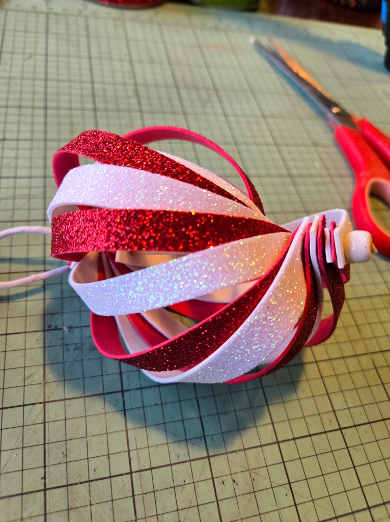 We cut glitter foam sheets into 3/8 inch strips about 8 inches long.