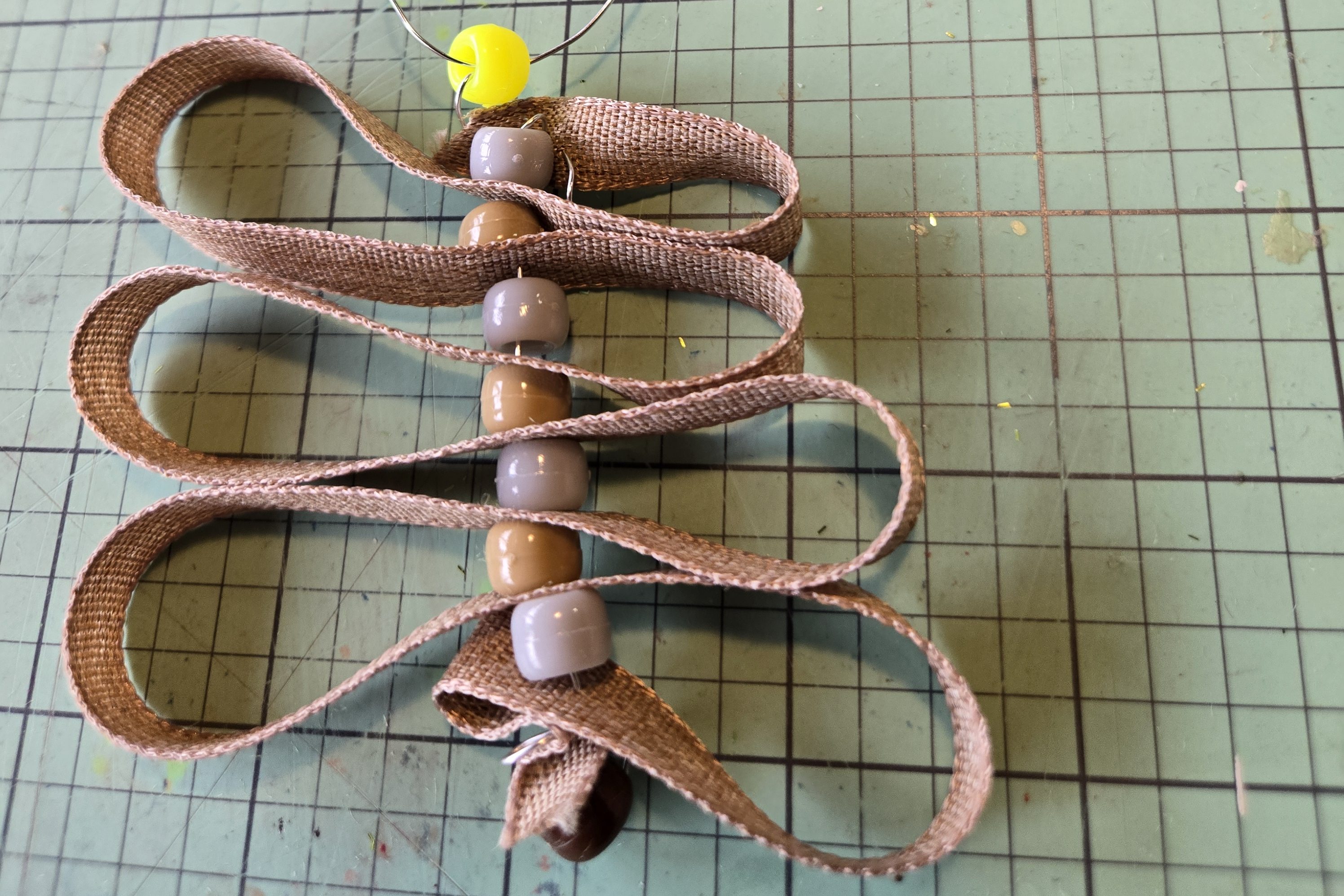 First feed the wire through a bead on the bottom and then alternate through the ribbon and the beads folding your ribbon to form a curve on each end. Finish with the wire and feed around the top bead to secure in place.